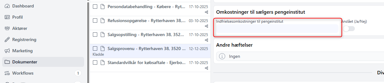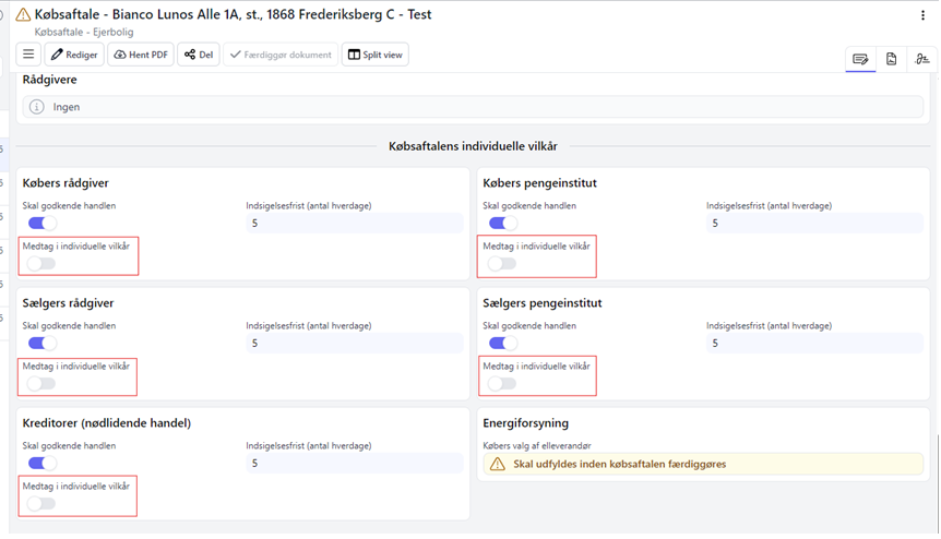 Ved implementeringen vil felterne for rådgiverforbehold automatisk blive slået fra på eksisterende sager og i eksisterende sagsskabeloner. Dette påvirker ikke sager, hvor købsaftalen allerede er færdiggjort.